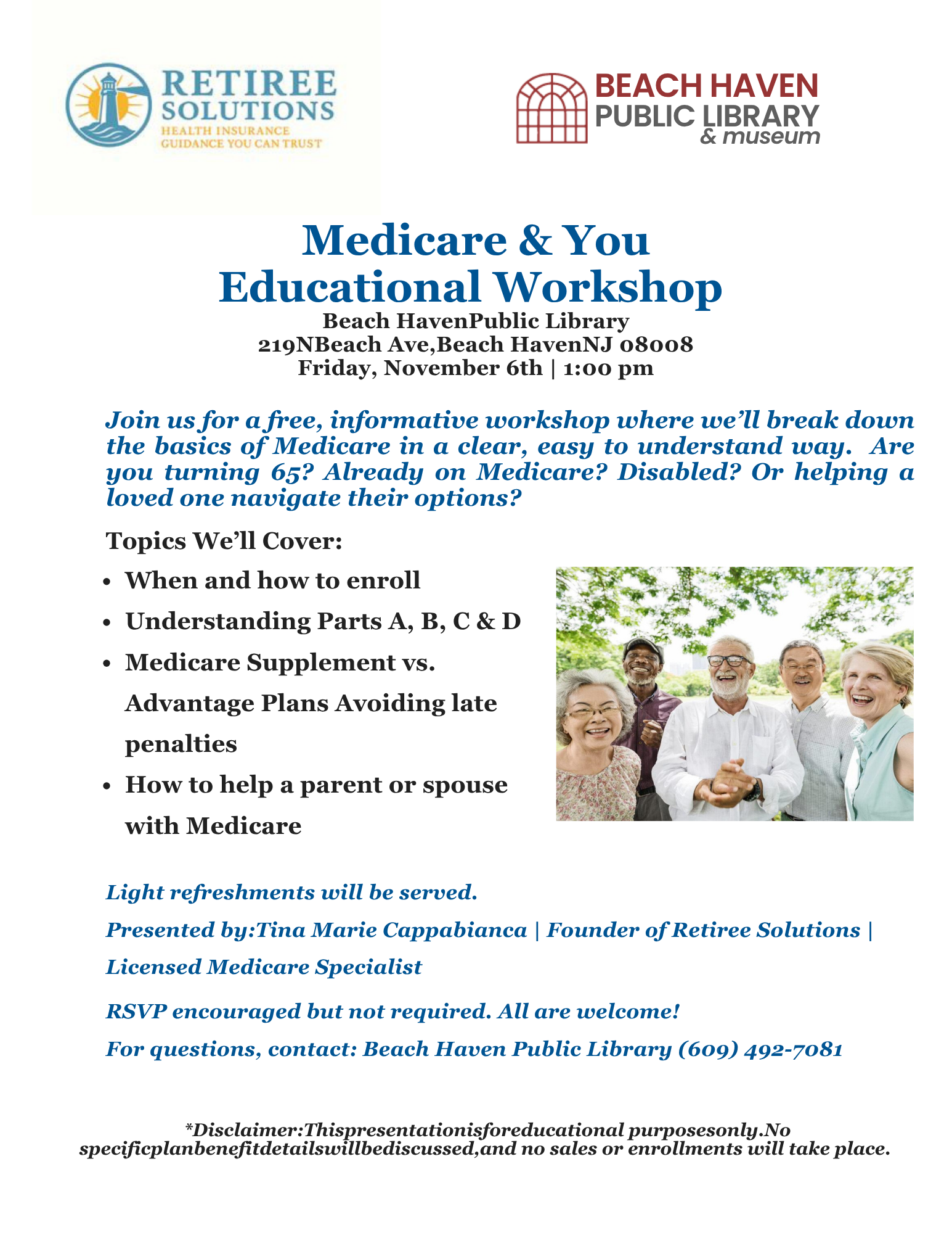 Medicare & You Educational Workshop Friday, November 6, 2026 1:00 PM 2:00 PM Beach Haven Public Library 219 North Beach Avenue Beach Haven, NJ, 08008 United States (map) Google Calendar ICS