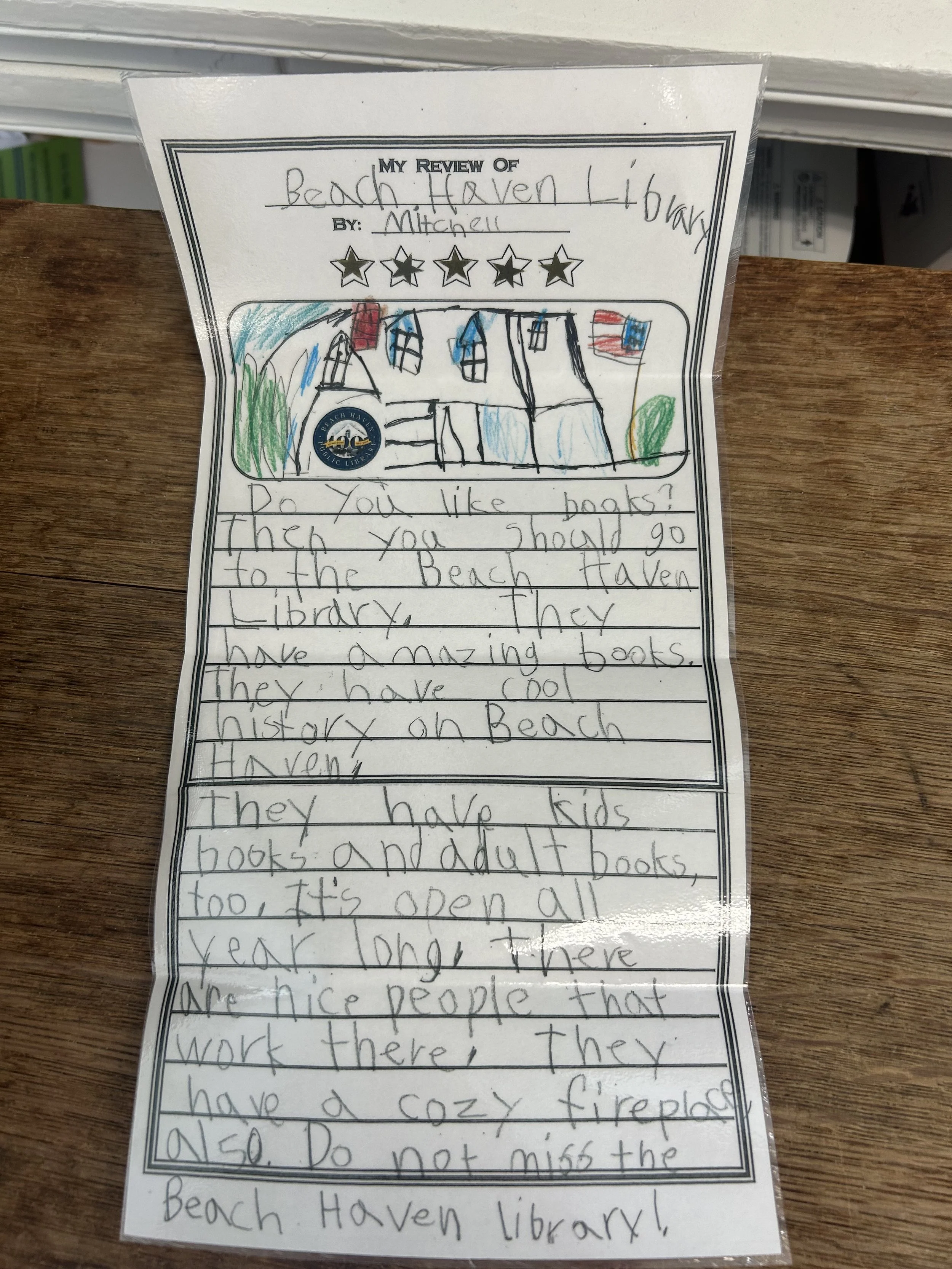 We are proud to report that Beach Haven Public Library received a glowing 5-star review from Mitchell, who confirmed that we have amazing books, cool history, kids books, adult books, nice people, and yes, a cozy fireplace.